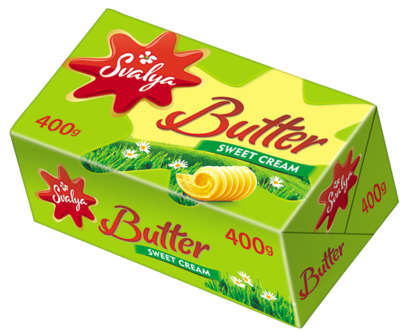 SVALYA sweet cream butter, 82%, 400g. The top quality butter is genuine and natural. It is made from sweet and sour cream, making it aromatic and nutritious. Our modern manufacturing technology maintains the butter’s ideal consistency, its delicate taste, and ensures it is easily spreadable.