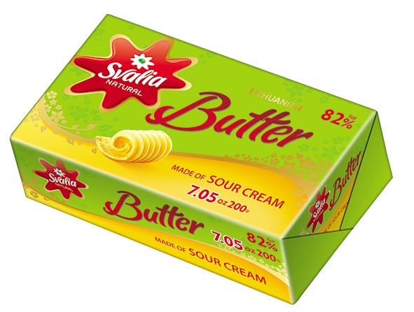SVALYA sour cream butter, 82%, 200g. The top quality butter is genuine and natural. It is made from sweet and sour cream, making it aromatic and nutritious. Our modern manufacturing technology maintains the butter’s ideal consistency, its delicate taste, and ensures it is easily spreadable.