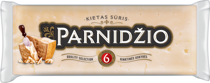 PARNIDŽIO kietasis sūris, 6mėn, 200g. Kietas sūris pasaulyje yra tituolajamas sūrio karaliumi. „Parnidžio“ sūriui bręstant susidaro būdingas kietam sūriui salsvas vaisių aromatas, gardus švelniai- pikantiškas skonis. Kuo ilgiau jis brandinamas, tuo daugiau įgauna naujų subtilių skonio ir aromato atspalvių.