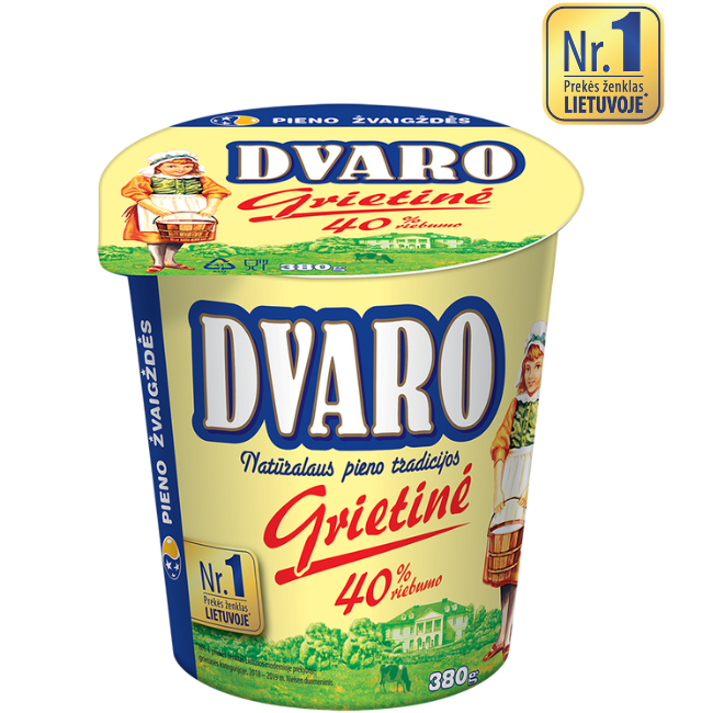 DVARO grietinė 40% riebumo, 380g. Legendinė Panevežio grietinė. Iki šiol populiariausia Lietuvoje daug metų nepralenkiama savo skoniu ir puikia konsistencija.