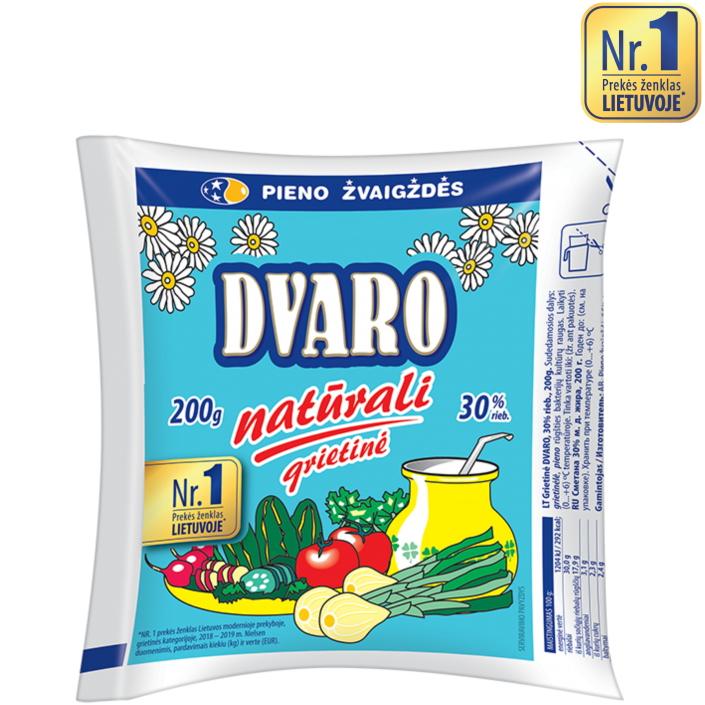 DVARO grietinė 30% riebumo, 200g. Legendinė Panevežio grietinė mėlyname maišelyje. Iki šiol populiariausia Lietuvoje daug metų nepralenkiama savo skoniu ir puikia konsistencija.