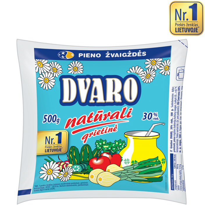 DVARO grietinė 30% riebumo, 500g. Legendinė Panevežio grietinė mėlyname maišelyje. Iki šiol populiariausia Lietuvoje daug metų nepralenkiama savo skoniu ir puikia konsistencija.