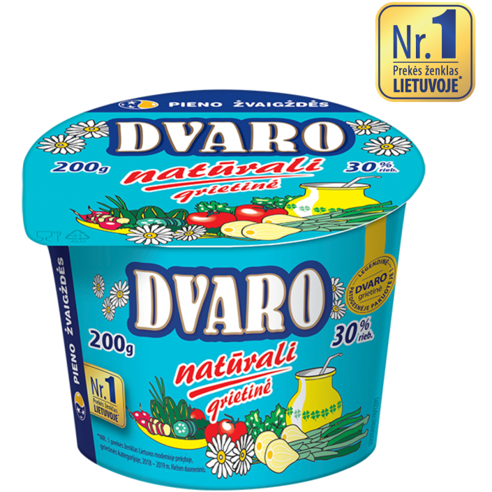 DVARO grietinė 30% riebumo, 200g. Legendinė Panevežio grietinė. Iki šiol populiariausia Lietuvoje daug metų nepralenkiama savo skoniu ir puikia konsistencija.
