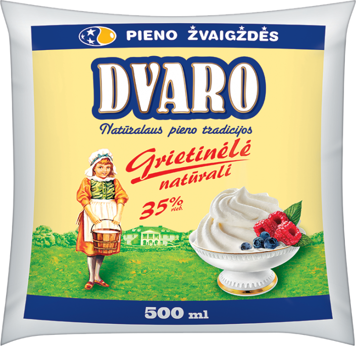 DVARO grietinėlė 35% riebumo, 500ml. 100% natūrali grietinėlė. Puikiausiai tinka kremams plakti ir kavai balinti.