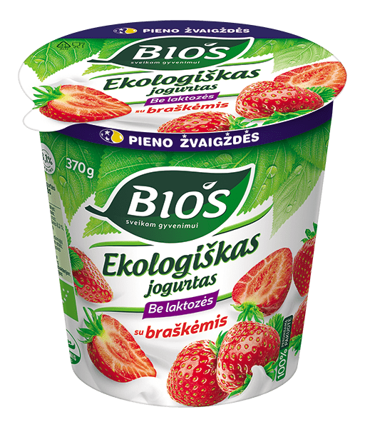 BIOS EKO jogurtas be laktozės, su braškėmis, 370g. Ekologiškas jogurtas “BIOS” vienas pirmųjų įgavo teisę oficialiai vadintis ekologišku. Jis ypatingas tuo, kad jo sudėtyje esantis pienas, ir uogienės yra sertifikuoti ekologiški produktai.