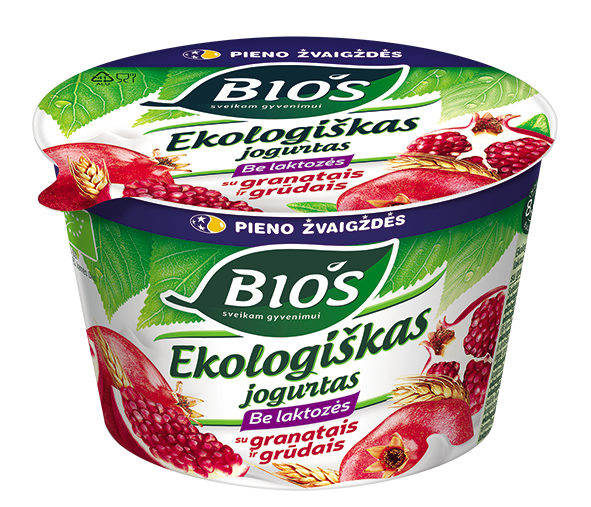 BIOS EKO jogurtas be laktozės, granatais ir grūdais, 200g. Ekologiškas jogurtas “BIOS” vienas pirmųjų įgavo teisę oficialiai vadintis ekologišku. Jis ypatingas tuo, kad jo sudėtyje esantis pienas, ir uogienės yra sertifikuoti ekologiški produktai.