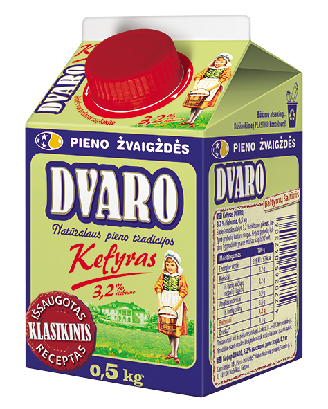 DVARO kefyras 3.2 % riebumo, 0.5kg. Klasikinis DVARO kefyras vartotojų labiausiai vertinamas dėl išsaugoto tradicinio skonio. Jį lemia gamyboje naudojamas kefyro grybas, kurį puoselėjame daugiau kaip 30 metų. Su gyvu grybo raugu pagamintas klasikinis kefyras yra ypač skanus ir maistingas, nes yra baltymų šaltinis.