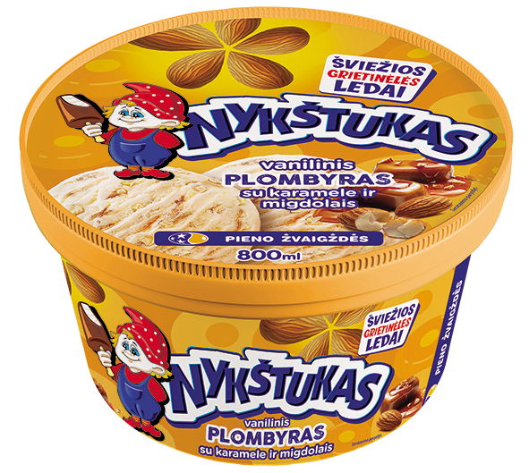 NYKŠTUKAS plombyras vanilinis su karamelės ir migdolų įdaru, 800ml. Visus metus švęskime vasarą ir prisiminkime vaikystę gardžiuodamiesi gaiviais, puriais, pasakiškais „Nykštuko“ ledais! Juos žino visi, nes tai ledai su kuriais mes užaugom!