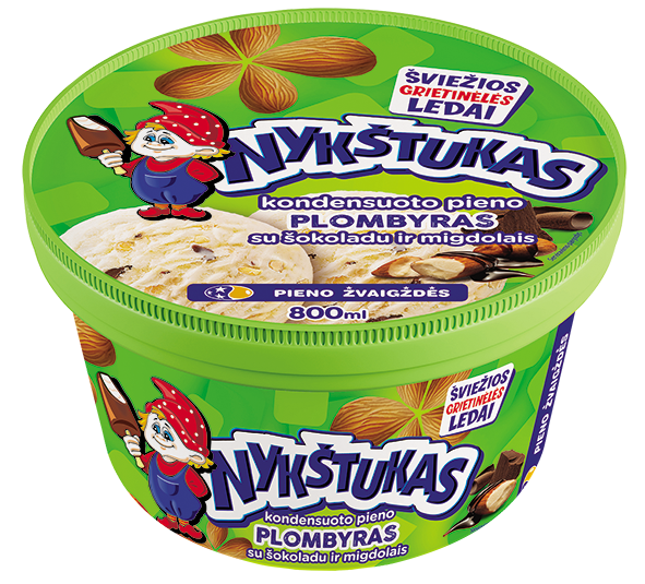 NYKŠTUKAS plombyras kondensuoto pieno su šokoladu ir migdolais, 800ml. Visus metus švęskime vasarą ir prisiminkime vaikystę gardžiuodamiesi gaiviais, puriais, pasakiškais „Nykštuko“ ledais! Juos žino visi, nes tai ledai su kuriais mes užaugom!