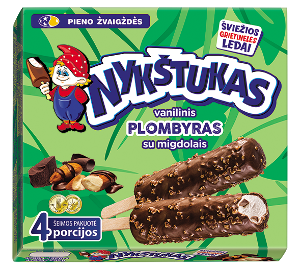 NYKŠTUKAS glaistytas plombyras vanilinis su migdolais, 4x80ml. Visus metus švęskime vasarą ir prisiminkime vaikystę gardžiuodamiesi gaiviais, puriais, pasakiškais „Nykštuko“ ledais! Juos žino visi, nes tai ledai su kuriais mes užaugom!