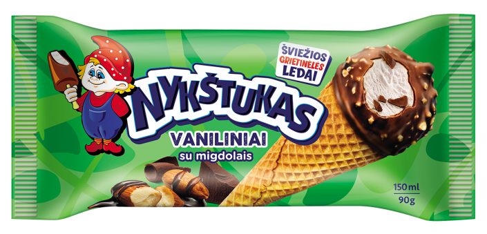 NYKŠTUKAS grietininiai ledai vaniliniai, 150ml. Visus metus švęskime vasarą ir prisiminkime vaikystę gardžiuodamiesi gaiviais, puriais, pasakiškais „Nykštuko“ ledais! Juos žino visi, nes tai ledai su kuriais mes užaugom!
