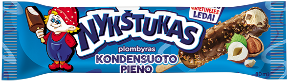 NYKŠTUKAS kondensuoto pieno plombyras su šokoladiniu glaistu ir lazdyno riešutais, 80ml. Visus metus švęskime vasarą ir prisiminkime vaikystę gardžiuodamiesi gaiviais, puriais, pasakiškais „Nykštuko“ ledais! Juos žino visi, nes tai ledai su kuriais mes užaugom!