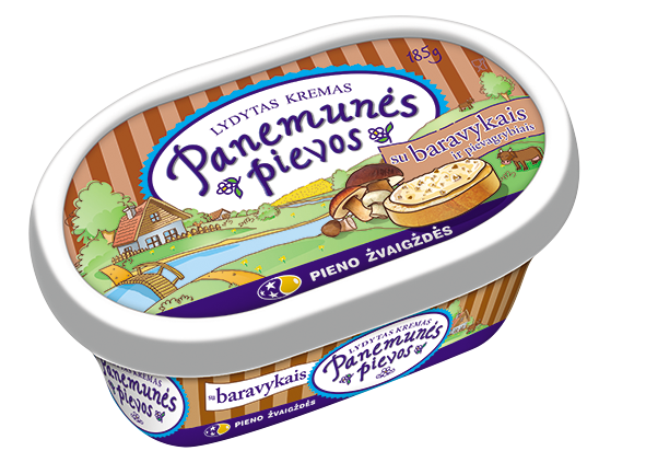 PANEMUNĖS PIEVŲ lydytas kremas su grybais, 160g. Lydytas kremas „Panemunės pievos“ gaminamas specialia technologija lydant šviežią varškę! Užteptas ant duonos riekelės, blynelio ar krekerio, šis lydytas kremas taps greitai paruošiamu gardžiu užkandžiu. Mėgstantys sočiai pavalgyti džiaugsis šiuo kremu ruošdami padažus, gardindami sriubas, užtepdami troškinamą ar kepamą mėsą, - patiekalams lydytas kremas suteiks sodrų pikantišką skonį.