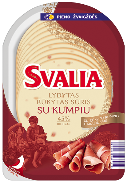 SVALIA lydytas sūris Rūkytas, su kumpiu, 150g. Subtilaus pikantiško skonio, malonaus laužo dūmo poskonio ir aromato. Lydomas iš aukštos kokybės fermentinio sūrio, rūkomas išskirtinai lapuočių medžių laužo dūmu!