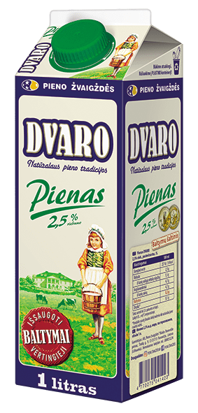 DVARO pienas 2.5 % riebumo, 1L. Populiariausias pienas, kuris vartotojų labiausiai vertinamas dėl gero šviežio pieno skonio. Jį lemia natūralūs baltymai išsaugoti naudojant unikalią gamybos technologiją. KTU Maisto institute atlikti tyrimai patvirtina, kad DVARO piene yra daugiausiai vertingųjų baltymų, todėl jis toks skanus ir naudingas organizmui.