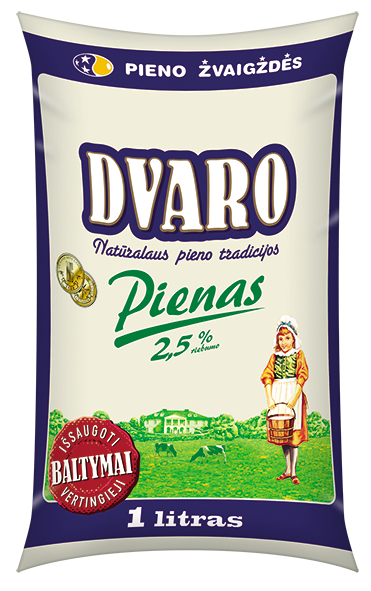 DVARO pienas 2.5 % riebumo, 1L. Populiariausias pienas, kuris vartotojų labiausiai vertinamas dėl gero šviežio pieno skonio. Jį lemia natūralūs baltymai išsaugoti naudojant unikalią gamybos technologiją. KTU Maisto institute atlikti tyrimai patvirtina, kad DVARO piene yra daugiausiai vertingųjų baltymų, todėl jis toks skanus ir naudingas organizmui.