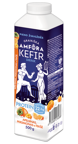 Kefyro gėrimas GRAIKIŠKA AMFORA PROTEIN su apelsinais, persimonais ir tekšėmis, 500g.