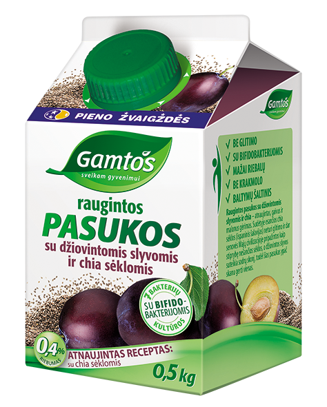GAMTOS raugintos pasukos su džiovintomis slyvomis ir kviečių sėlenomis, 0.5kg. Pasukos susidaro iš šviežios grietinėlės mušant sviestą. Pasukų produktai gausūs lecitino. Jie vertingi, lengvai virškinami ir tinka net netoleruojantiems laktozės!
