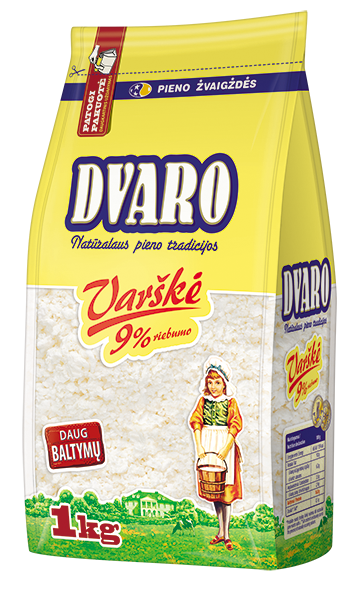 DVARO varškė 9%, 1kg. Nuo seno vertinama klasikinė varškė naudinga tiek mažiems, tiek dideliems, nes yra baltymų šaltinis. Neapsakomai gardi valgant vieną, tinka gaminant visus varškės patiekalus.